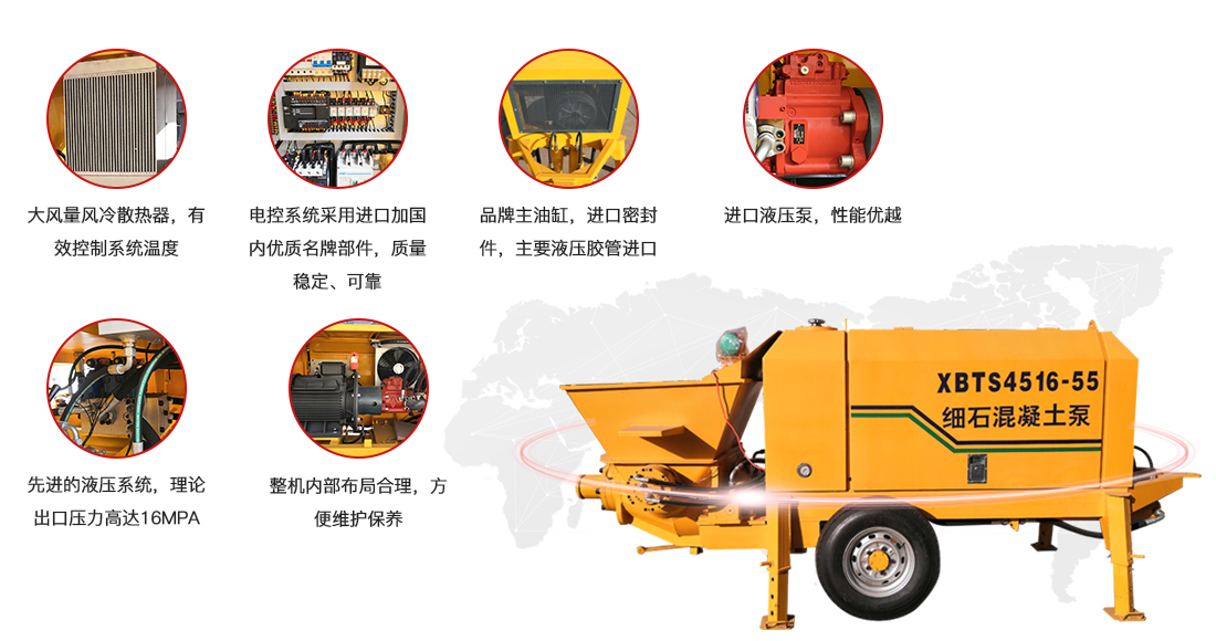 2018年我公司经过近10年的技术积累和市场调研又陆续开发了XBTS50-55细石混凝土两用泵和XBTS4516-55高压细石混凝土泵两款新产品,XBTS50-55既可以泵送标准混凝土又可以泵送细石混凝土,特别适合地下车库及大面积地面施工,施工效率高,XBTS4516-55高压细石混凝土泵理论出口压力达到16Mpa,主要面向超高楼层的细石混凝土泵送,泵送高度可达200米。